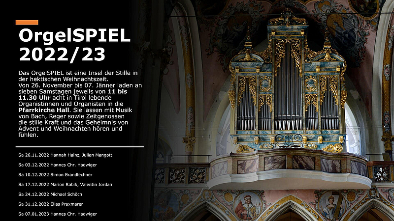Das OrgelSPIEL ist eine Insel der Stille in der hektischen Weihnachtszeit. Von 26. November bis 07. Jänner laden an sieben Samstagen jeweils von 11 bis 11.30 Uhr acht in Tirol lebende Organistinnen und Organisten in die Pfarrkirche Hall. Sie lassen mit Musik von vor allem Bach und Reger sowie Zeitgenossen die stille Kraft und das Geheimnis von Advent und Weihnachten hören und fühlen.